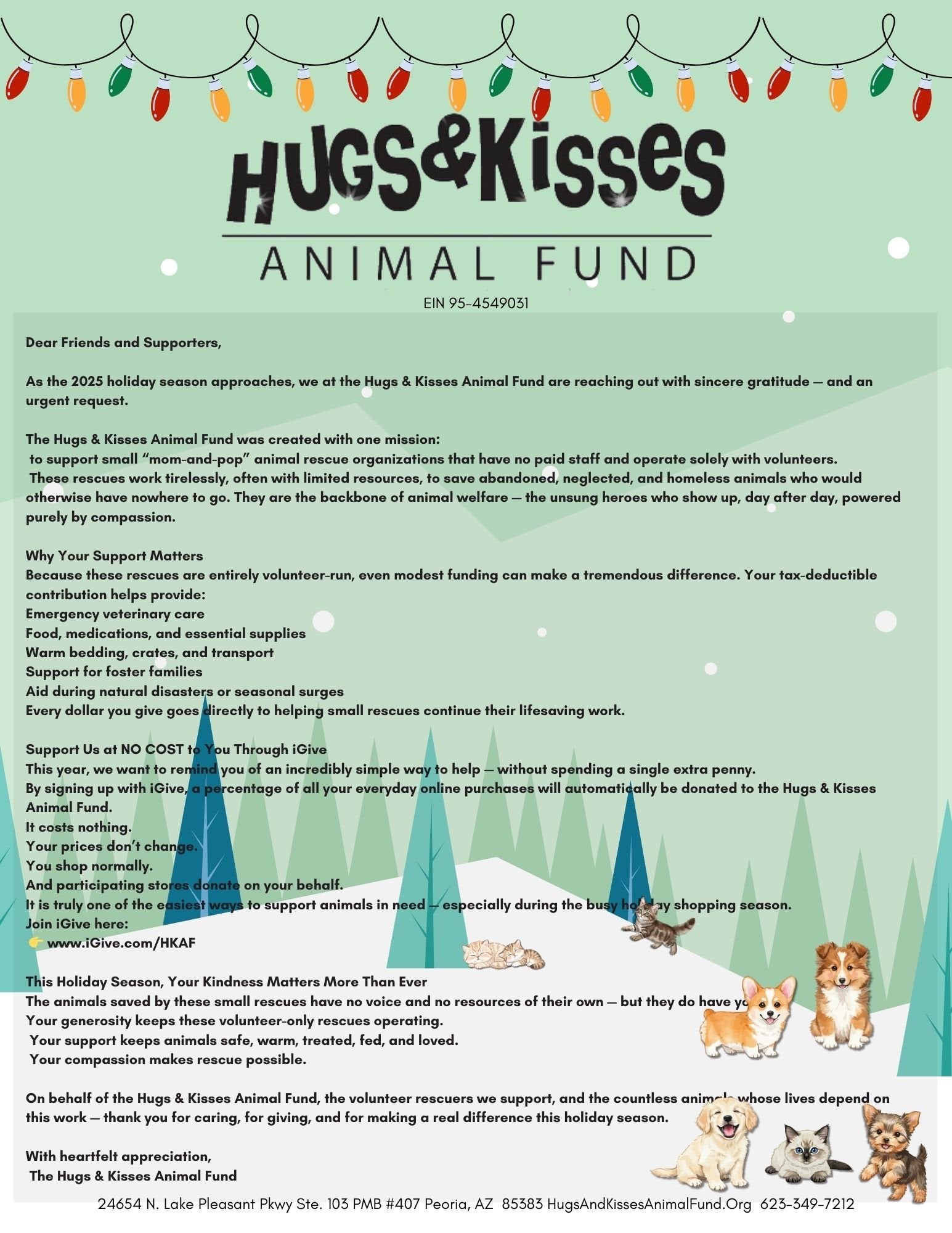 Your donation provides food, shelter, medicine, veterinary care, and comfy blankets or beds for homeless pets and animals. We provide assistance for natural emergencies, senior pet sanctuaries, Veteran rehabilitation through animals, Indian reservations and Spay Neuter programs